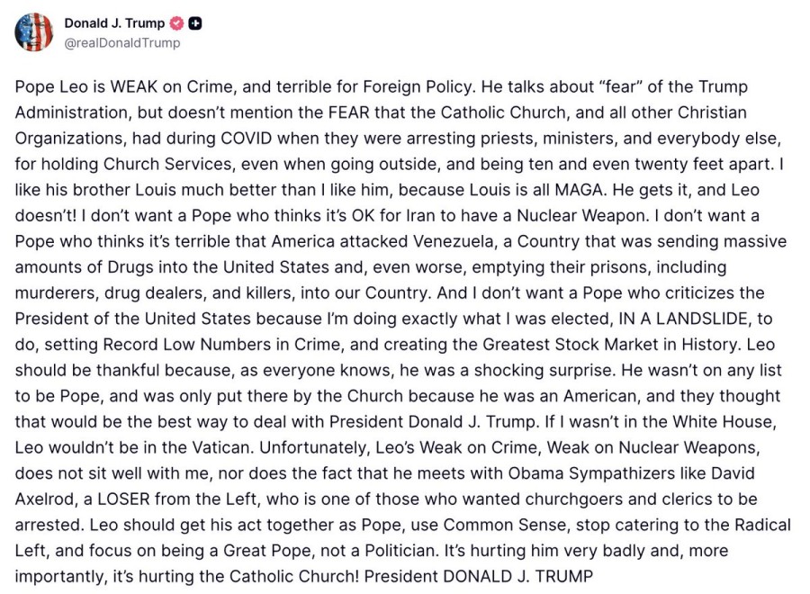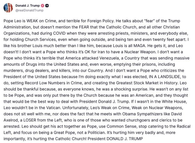 In a social media statement, Trump accused the Pope of being “weak on crime” and criticized his views on international affairs, including positions related to Iran and broader geopolitical matters.