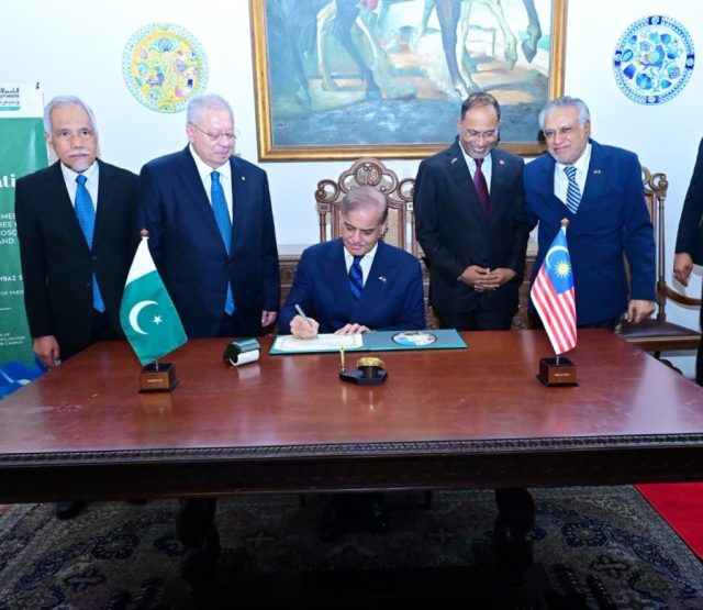 KUALA LUMPUR: Prime Minister Shehbaz Sharif writes remarks in visitors’ book at the International Islamic University Malaysia