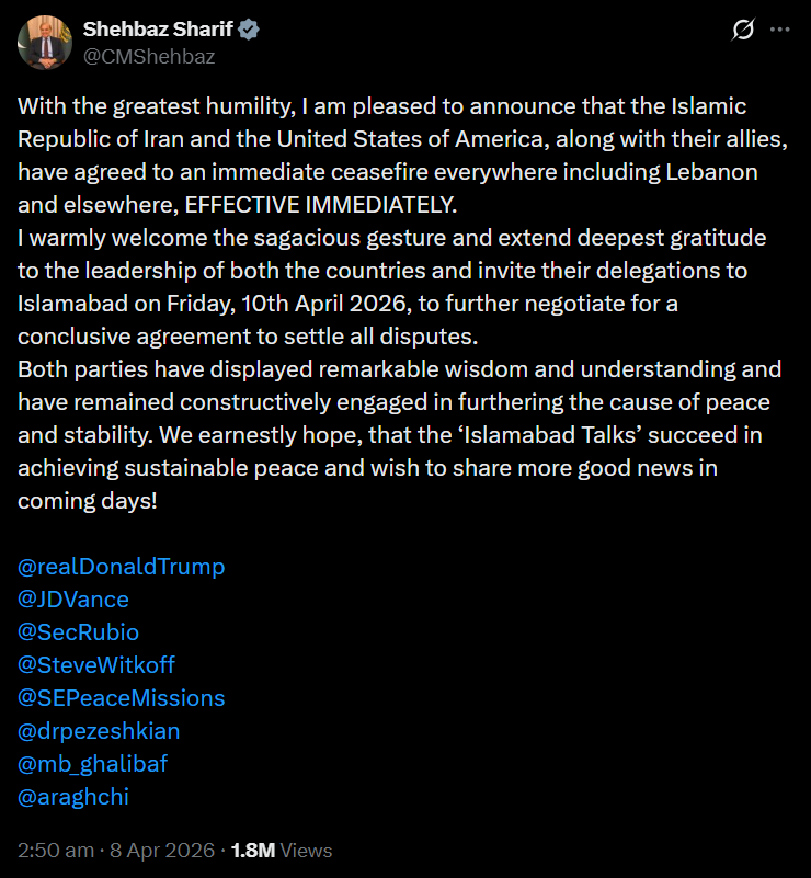 ISLAMABAD, Wednesday, April 8, 2026 (WNP): Prime Minister Shehbaz Sharif on Wednesday announced a major diplomatic breakthrough, stating that the Islamic Republic of Iran and the United States of America, along with their allies, had agreed to an immediate and comprehensive ceasefire across conflict zones, including Lebanon.