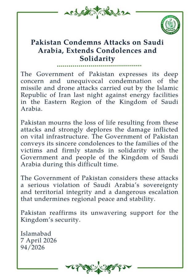 ISLAMABAD, Tuesday, April 7, 2026 (WNP): The Government of Pakistan on Tuesday strongly condemned the missile and drone attacks carried out by the Islamic Republic of Iran against energy facilities in the Eastern Region of the Kingdom of Saudi Arabia, terming them a grave escalation that threatens regional peace and stability.