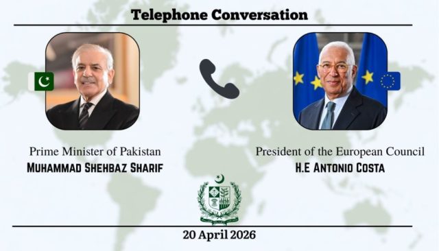 ISLAMABAD, Monday, April 20, 2026 (WNP): Prime Minister Muhammad Shehbaz Sharif received a telephone call on Monday evening from the President of the European Council, António Costa, during which both leaders discussed the evolving situation in the Middle East.