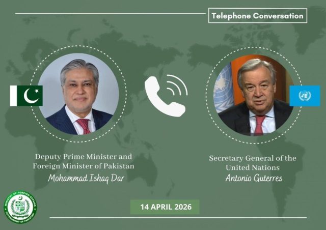 ISLAMABAD, Tuesday, April 14, 2026 (WNP): Deputy Prime Minister and Foreign Minister Senator Mohammad Ishaq Dar received a telephone call from United Nations Secretary-General Antonio Guterres on Tuesday, during which the two leaders discussed ongoing efforts for regional peace and stability.