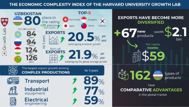 TASHKENT, Wednesday, April 23, 2025 (WNP): Uzbekistan has recorded remarkable economic progress, rising 25 positions over the past five years to rank 80th among 145 countries in the latest Economic Complexity Index (ECI) published by the Growth Lab at Harvard University.